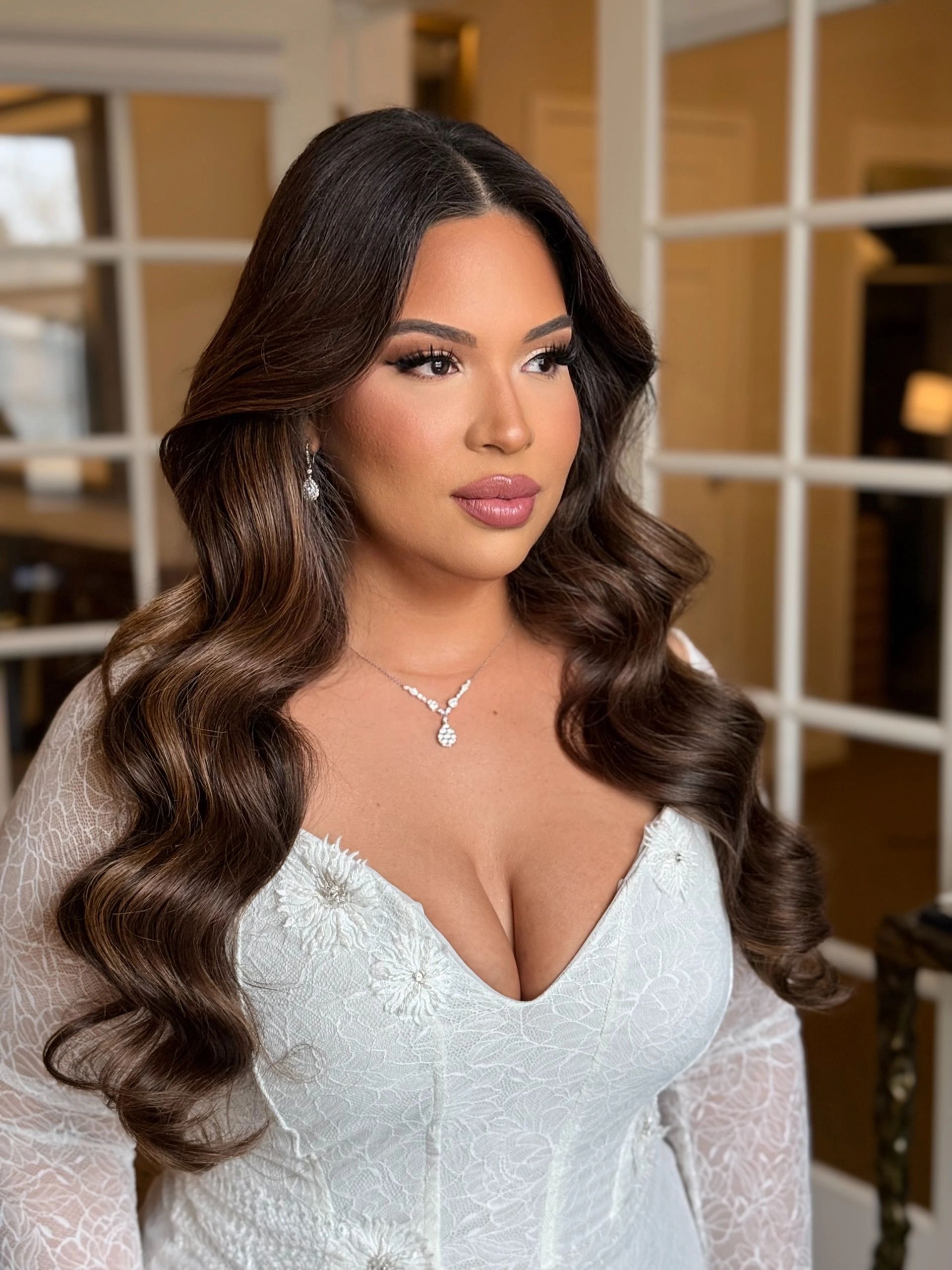 Luxury bridal hairstyling designed to complement your features, gown, and overall wedding aesthetic. Our experienced bridal hairstyling team specializes in timeless, polished looks—from soft waves and Hollywood glam to elegant updos and textured styles—created to last throughout your entire wedding day.